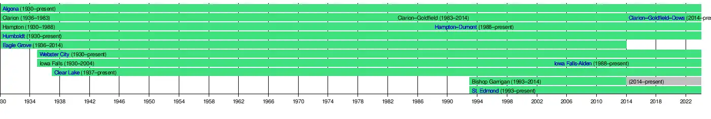 During the 1993–94 academic year, Bishop Garrigan (Algona) and St. Edmond (Fort Dodge) joined, expanding the league to ten teams. This structure lasted until 2014, when both Bishop Garrigan and Eagle Grove departed, returning the conference to eight schools.