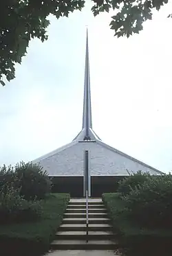 The church is significant for its progressive and oft-copied design. Set on 13-acre (5.3 ha) grounds designed by Dan Kiley, the building is hexagonal in shape, with a central metal spire that is 192 feet (59 m) high.[3] Below the spire, there is an oculus that admits light into the main level. The sanctuary, whose interior is designed by Alexander Girard, is located at the center of the building. Rows of pews surrounded the centrally-placed communion table. The lower level contains classrooms, an auditorium, a kitchen, and an activities area.[4]