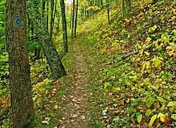 The NCT continues north through Cook Forest State Park, followed by additional state forest and game land districts.[48] The trail crosses into Allegheny National Forest, through which it will hike for about the next about the next 99 miles (159 km).[49] Along the way, it briefly follows the same path as the popular Minister Creek Trail,[50] and crosses the southeastern arm of the Allegheny Reservoir on a road bridge at Red Bridge Recreation Area.[48] Near the New York Border, the NCT enters the northern segment of Allegheny National Recreation Area and uses a portion of the Tracy Ridge Hiking Trail System to walk alongside the reservoir for an extended distance.[51] The NCT then reaches the New York border and continues as a footpath into Allegany State Park.[48]
