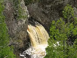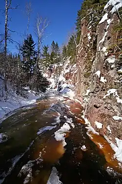 The wilderness footpath continues to the east through Chequamegon–Nicolet National Forest for several dozen miles, including trails through Rainbow Lake Wilderness and Porcupine Lake Wilderness.[12] After exiting the national forest, the NCT returns to rural road walking, and passes through Mellen in Ashland County. This is followed by about nine miles (14 km) of footpaths through Cooper Falls State Park. Next is a lengthy hike through Iron County Forest, as the trail trends to the north. The trail exits the county forest for a few miles, crosses US 2, and then enters another segment of the county forest. The NCT briefly encounters the shore of Lake Superior at Saxon Harbor County Park, then joins a rural road to a remote crossing of the Montreal River at the Michigan state line.[13]