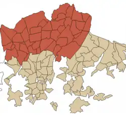 In the city's official regional division, Pohjoinen suurpiiri is one of Helsinki's seven major districts, which is divided into five basic districts, which are Maunula, Länsi-Pakila, Tuomarinkylä, Oulunkylä and Itä-Pakila.[4]