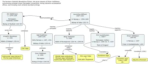 ![]() Relationships between the major members of the North Icelandic Benedictine School |