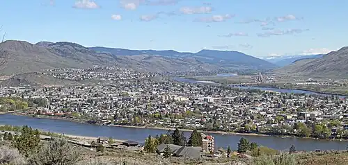 North Kamloops is a neighbourhood and former town located in the City of Kamloops, British Columbia, Canada. It is located immediately to the northwest of Downtown Kamloops across the confluence of the North and South Thompson Rivers. In 2016, North Kamloops had a population of 10,995, or 12.2% of Kamloops' total population of 90,280, and had the highest population density of any neighbourhood in the city at 2,750 people per km2.[1] North Kamloops is one of four neighbourhoods the City of Kamloops considers part of its Core, the others being Downtown, Sagebrush, and the West End - all on the south shore of the city.[2]