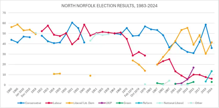 Formerly held by Labour from 1945 to 1970, then the Conservatives from 1970 to 2001, the seat was represented by the Liberal Democrat Norman Lamb from 2001 until he stood down for the 2019 general election, when the Conservatives regained the seat from the Lib Dems with a swing of 17.5%. However the Lib Dems re-took the seat at the following general election in 2024 with a swing of 16.8%.