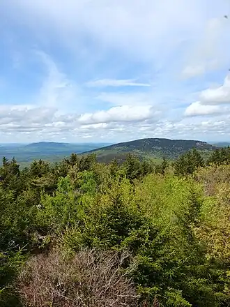![]() North Pack Monadnock (on the right) viewed from Pack Monadnock. The mountain in the distance to the left is Crotched Mountain. | |