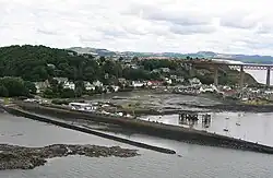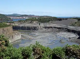 While transport and especially the railways and ferries have been North Queensferry's most obvious industries, one local industry that pre-dated the arrival of the railway is quarrying. In the north east of the peninsula on which North Queensferry stands there is a vast quarry, Cruicks Quarry, owned by Tarmac.[16] The stone is whinstone, or quartz dolerite, an extremely hard igneous rock found here as a geological sill. Dates vary, but the quarry has been worked at least since the 1820s. The quarry has been non-operational since 2009, although Planning Permission was granted by Fife Council in 2012 for further working.[17] The stone from the sill was crushed down to various sizes, most valuably the 10 to 14 mm size used for road surfacing.[18] In earlier times stone from the quarry was used to build the docks at Leith and Liverpool as well as many of the pavements of London. Ferryhills Road, which leads out of the village towards Inverkeithing, skirts the edge of this huge quarry. A viewing platform on the west is now overgrown, but the quarry can be seen by turning right at Jamestown into Cruickness Road, then following the road round to the old weighbridge. The pool occupied by Deep Sea World is also an old whinstone quarry.