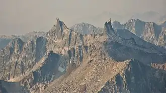 North Raker, also known colloquially as "The Rakers", is part of the Sawtooth Range which is a subset of the Rocky Mountains.[4] The remote mountain is situated 18 miles south-southwest of Stanley, Idaho, in the Sawtooth National Recreation Area. Precipitation runoff from the mountain drains to the South Fork Payette River via Pinchot Creek (west slope) and Fall Creek (east slope). Topographic relief is modest as the summit rises 2,400 feet (730 meters) above each creek in approximately one mile. The first ascent of the summit was made by Fred Beckey and Pete Schoening in 1949.[1] This landform's toponym has been officially adopted by the United States Board on Geographic Names.[3] The descriptive name was applied in 1927 by surveyor Arval Anderson and refers to how the shape of the peak resembles the "raker tooth" of a crosscut saw.[5]
