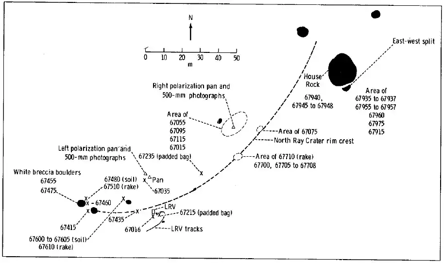 North Ray crater is approximately 1 km in diameter and approximately 240 m deep.[2] The astronauts observed that the upper 50 m of the slope is gentle, but that it becomes steep below 50 m, and they could not observe the bottom. The inner slopes are covered by boulders up to 5 m across. A huge (10 m high x 20 m long) boulder, known as House Rock, lies near the southeastern rim. A smaller boulder that is almost certainly a fragment of House Rock is officially known as South Boulder, but unofficially known as Outhouse Rock.[3] The ray system, which can be seen from orbit, was not obvious on the ground.
