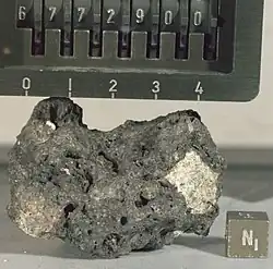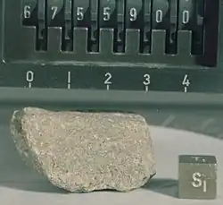 breccia | Exterior surface has a thin brown patina with micrometeorite pits; has been dated at 4.2 b.y. with exposure to cosmic rays for ~ 50 m.y. (age of North Ray Crater) |