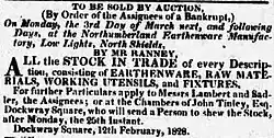 In October 1826 the business was advertised for sale, under the name of "The Northumberland Earthenware Manufactory"[5] and a little later, Mr Bird was also declared bankrupt in October 1827[6] and the business was sold at auction in January 1828.[7]