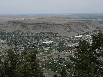 North Table Mountain is a mesa on the eastern flank of the Front Range of the Rocky Mountains of North America. The 6,555-foot (1,998 m) mesa summit is located in North Table Mountain Park, 3.4 miles (5.5 km) north by east (bearing 9°) of downtown Golden, Colorado, United States, in Jefferson County.[1][2][3][4]