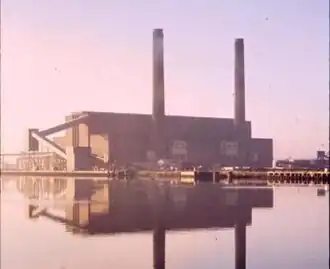 The station was designed by the engineering consultants Merz & McLellan. The station used two Metropolitan-Vickers 11.5 kV, 40Hz 20,000 kilowatt (kW) turbo-alternators (actually 2 x 10,000 kW tandem alternators) to generate electricity, giving it a total generating capacity of 40,000 kW.[3] Ten Babcock & Wilcox boilers which were used to provide the steam to the turbines in the station, were famous in engineering circles at the time. In 1918 the boilers became the first in the world to use steam at up to 450 psi, and pioneered the practice of reheating it during expansion in the turbine plant.[4][5] This development resulted in a further increase in the efficiency of power generation, and an appreciable decrease in the quantity of coal consumed per unit of electricity generated.[1] In 1922, W.S. Monroe of the Chicago-based consulting firm Sargent & Lundy described North Tees Power Station as "the most advanced power station in the world".[3]