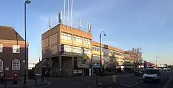 Opposite this church, at 124-132 St Albans Road, stands Hille House, the former offices of the furniture design firm Hille. This 1959 concrete office block has been locally listed as it is the work of the noted architect Ernő Goldfinger and an example of Brutalist architecture.[12] The front of the building features a cantilevered concrete box glazed with brightly coloured glass, a signature of Goldfinger's design and the first of his buildings to have this feature.[13] Behind this stands the former Wells Brewery (1890–1901). This was the premises of Wells Watford Brewery Ltd, a local beer brewing company. The brewery was taken over by Benskins Brewery in 1951 and closed in 1955.[8][14]