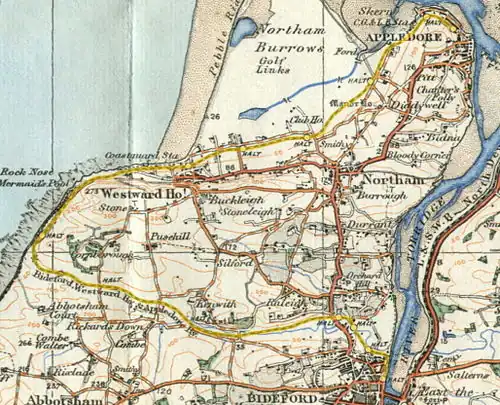 Northam station was the terminus of the line in 1901[4] prior to the extension to Appledore in 1908. The station stood a little way from the village of Northam. Many of the passengers were golfers on their way to the links on Northam Burrows.[5]