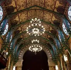 The current building, the third guildhall, designed by Edward William Godwin[4] in the Gothic Revival style, was officially opened on 17 May 1864.[5] The original part of the building was symmetrical with three first-floor windows either side of the main entrance,[6] above which rose a clock tower with a steeply pitched roof.[1] The clock, by J. Moore & Sons of Clerkenwell, was installed in 1867,[7] along with a hemispherical bell to strike the hours.[8]
