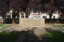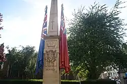 The whole memorial is raised on a stone platform that forms a narrow path between the stone and the obelisks. The Stone of Remembrance is further raised on three stone steps. The memorial stands in a small garden now just outside the All Saints' churchyard, defined by a low stone wall to the front and a yew hedge to the rear with ornamental gateways to either side. The gates are of cast iron and supported by large stone piers with urn finials. The wall is inscribed: "TO THE MEMORY OF ALL THOSE OF THIS TOWN AND COUNTY WHO SERVED AND DIED IN THE GREAT WAR".[2][20][21]