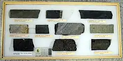 The NAKP volcanics, including the ML pipes, contain abundant lapilli and olivine supported in a fine-grained groundmass. Other minerals may include serpentine, clay minerals, carbonate minerals, phlogopite, ilmenite, perovskite, spinel, apatite, pyrite and, in some cases, diamonds.[3]