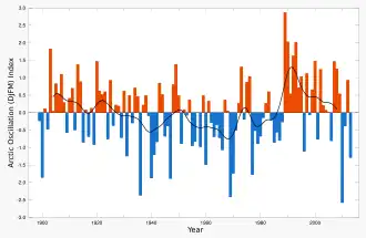 - ^ "Arctic Oscillation (AO) time series, 1899 – June 2002". Archived from the original on 2013-05-18. Retrieved 2012-01-21.