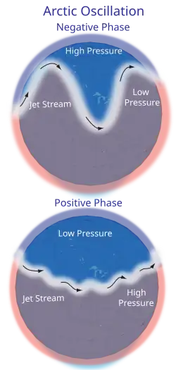 The degree to which Arctic air penetrates into middle latitudes is related to the AO index, which is defined by surface atmospheric pressure patterns. When the AO index is positive, surface pressure is high in the polar region. This helps the middle latitude jet stream to blow strongly and consistently from west to east, thus keeping cold Arctic air locked in the polar region. When the AO index is negative, there tends to be low pressure in the polar region, weaker zonal winds, and greater movement of frigid polar air into middle latitudes."[4]