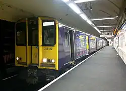 Services are currently operated by dual-voltage Class 717 electric multiple units (EMUs), which replaced Class 313 units as part of a franchise commitment when Govia Thameslink Railway took over management of the line and its services.[19] The Class 717s began to enter service in March 2019.[20] To comply with regulations for trains operating in single-bore tunnels where there is not enough clearance space for side evacuation, they have emergency doors at both ends of a unit. When operating on 750 V DC, the two motor coaches of a Class 313 collected traction current from their own shoe gear only; there was no traction bus linking them together as found on most electric multiple units. All of the Class 313 units when operating on the NCL had their Driving Motor B vehicle at the London end, and whilst on 750 V DC were electronically limited to 30 mph (48 km/h),[21] which is the maximum line speed.[4] All stations are long enough to accept six-car trains.[22]