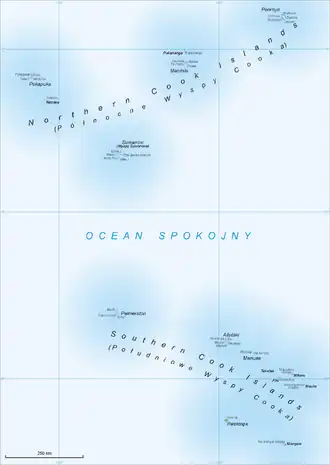The chain forms a roughly inverted triangular shape, stretching from Penrhyn in the northeast to Pukapuka in the northwest and to Suwarrow in the south. The Northern Cook Islands are separated from the Southern Cook Islands by a wide stretch of the Pacific Ocean, with the nearest part of the Southern chain being Palmerston Island, 500 kilometres (310 mi) due south of Suwarrow.