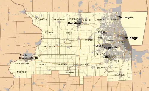 ![]() Counties that are colored red are considered a part of the Northern Illinois region. | |