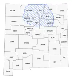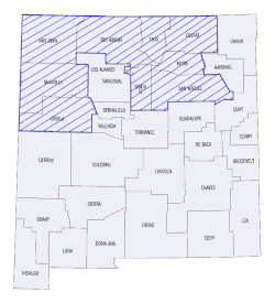 The traditional southern boundary of the area is an escarpment called La Bajada southwest of Santa Fe.[1] The other boundaries are poorly defined. The map in Cobos (1983) is a guide: from La Bajada the boundary runs northwest about 50 miles (80 km) west of U.S. Routes 285 and 84, and northeast about 20 miles (30 km) east of Interstate 25, to the Colorado border. The area might also be described roughly as comprising Rio Arriba, Los Alamos, Taos, and Colfax Counties; northeastern Sandoval County, northern Santa Fe County; and western San Miguel and Mora Counties, possibly with parts of adjoining counties. To the west is the Four Corners region; to the east are the high plains of Eastern New Mexico.
