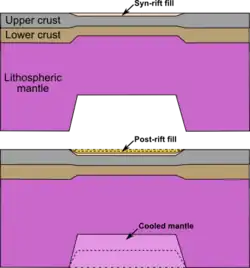 The main rift or "syn-rift" stage describes the phase of active stretching and fault block rotation. Syn-rift subsidence results from the elastic/isostatic adjustment of the crust due to mechanical stretching of the lithosphere.[3] The subsidence is counteracted by upwelling of the asthenosphere into the space created by the mechanical stretching and thermal upward displacement of the asthenosphere-lithosphere boundary, causing uplift of the rift zone.[24][16][25] The fundamental architectural element in many extensional basins is the half-graben, formed within the hanging walls of major rift-bounding or intra-rift basin faults. The location and number of half grabens are influenced by the position of the main faults and the width of the rift zone, which depends on the rheology, crustal thickness and stretching factors.[3]