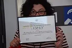 Alison Gaylard holding the Thornett Award for the promotion of reason, presented to NRVS at the 2014 Australian Skeptics National Conference