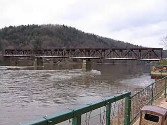 From Clarion Jct., the K&K wound its way through fields and woods just outside Clarion, and then passed through the village of Lucinda. Between 1987 and 2005, the K&K had its rolling stock and locomotives located in the small village Marienville. The trains were eventually moved to Kane in early 2006. Between 1987 and 2004, the railroad ran a tourist railroad from Marienville to Kane, then passed through the borough of Mount Jewett to Kinzua Bridge State Park. The Northern Sub. had its official north end of the line located in Mount Jewett, but the K&K decided to extend the line to the Kinzua Bridge (that was once owned by the Erie Railroad) where the train would take tourists over the viaduct. In 2003, half the viaduct was toppled over by a tornado. The K&K ran the train to the park for another year, but service was ultimately cut, due to the loss of riders wanting to go over the bridge. Another tragedy struck in March 2008. Arsonists set fire to the enginehouse where the locomotives were kept after being moved from Marienville. Later that year, the Knox and Kane was sold at auction, but the stretch of rails operated by the K&K were left in place. Most of the tracks dated back to the 1920s when most of the original 3 ft (914 mm) gauge rail was replaced with 4 ft 8+1⁄2 in (1,435 mm) standard gauge rail on the Northern Subdivision. In the spring of 2010, the Kovalchick Corporation began the long process of removing the rail crossings along state roads between Clarion and McKean counties.[1]