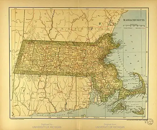 The location where these two surveyed lines met (the straight westward line and the curved line following the Merrimack River) was marked by a pine tree called the "Old Boundary Pine". The tree was marked by George Mitchell, one of the surveyors, on March 21, 1741 to indicate the location where the lines met. The pine tree is long gone, but the point (officially at 42°41′50.25″N 71°19′22.02″W / 42.6972917°N 71.3227833°W)[3][a] is today marked by a granite monument known as the Boundary Pine Monument, the current form of which was placed in 1890. Elsewhere, the boundary are made by 50 large granite markers, along with several other markers, including a copper bolt set in granite at the tripoint between Vermont, Massachusetts, and New Hampshire. The Old Boundary Pine was located 57.8 miles (93.0 km) east of this point. The "curved" segments roughly following the course of the Merrimack at a distance 3 miles north of it are not true curves, but rather a series of line segments approximating the curved course of the river. Another granite marker, also placed in 1890, stands on the beach between Salisbury, Massachusetts and Seabrook, New Hampshire at 80 feet from the high tide line, marking the end of the surveyed border, with the border taken to extend into the Atlantic Ocean to the "limit of State jurisdiction."[5]