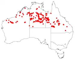 Hakea chordophylla ranges across the interior of central and northern Australia, from western Queensland through to northern Western Australia, to south of Karratha. A widespread species growing in spinifex grassland, woodland and scrubland on stony or red-brown sandy soil sometimes in stony laterite.[3][7]