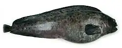The northern wolffish is a robust, elongate fish with a large head, sharp snout and small eyes. The teeth are distinctive and prominent with large canine-like teeth to the front of the jaws and molar-like teeth at the back of the jaws. It does not have any pelvic fins. The overall colour of the body is greyish to dark brown with a pale purplish sheen and there are frequently marked with many but vague dark bars or spotting.[7] The tissue of the muscles is soft and resembles jelly. The vomerine teeth are large, and may be rounded or pointed and extend back to the line of palatine teeth. The caudal fin is truncate and contains between 18 and 22 fin rays.[8] The maximum published total length is 180 cm (71 in) and the maximum published weight is 20 kg (44 lb).[4]