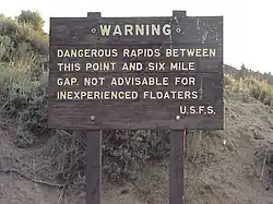 Cowpie (also known as Houserock)- This long rapid begins some time after crossing into Wyoming. The rapid begins after a leisurely right turn in the river and the gradient noticeably increases. Also, a large outcrop of granite on river-left that resembles a cowpie marks the entrance. At the first corner (a left turn) a particular maneuver is required to pass an obstacle known as Split Rock (also known as Cowpie Rock). This is generally navigated on river right with a hard pull back to the left. Proper navigation of Split Rock allows for the ideal set up for the remainder of the rapid. The flow is obstructed by several large boulders and the current weaves from bank to bank. Once the river narrows into a sheer-walled canyon, Cowpie is over and Narrow Falls has arrived. There is no gap between Cowpie and Narrow Falls. The two rapids flow seamlessly into one another. A mistake in Cowpie could prove disastrous in the Falls.