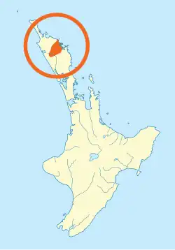 | Approximate known distribution (in orange) of the Northland mudfish on a map of the North Island | |