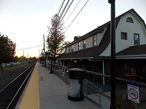 It was designed in a manner similar to stations such as those in Riverhead, Bay Shore, Manhasset, and Mineola. It also served as the south end of a trolley Line into Northport from 1902 to 1924.[5][6] A freight house from Camp Upton was moved to Northport station in April 1922, after the railroad station there was dismantled. A high-level platform and a pedestrian bridge were added during the late 20th century. Northport station features two large parking lots; the larger lot is adjacent to the platform and the smaller lot is on the opposite side of the track. The pedestrian bridge connects the lots, and is wide enough to accommodate a second track and second platform.
