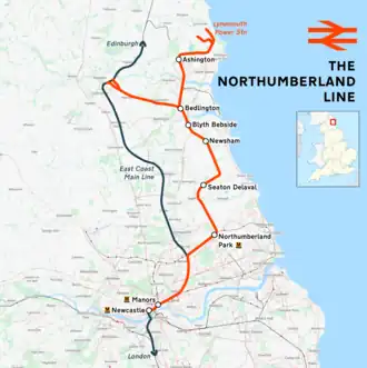 The Northumberland Line is a railway route in North East England; it has reintroduced passenger services to lines in south-east Northumberland that had been freight-only for many years. Under the scheme, a new passenger service links some of Northumberland's major population centres in Ashington, Bedlington and Blyth to the nearby city of Newcastle upon Tyne.[1]