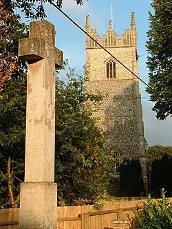 The church of St Andrew dominates the village. In its oldest parts, it dates from the early thirteenth century.[9] It was built in the Perpendicular and Early English styles,[10] having chancel, nave and aisles, and tower built in the fourteenth century, containing eight bells and a clock. The tower and church are built principally of flint and the tower has various devices inlaid in this material.[11]