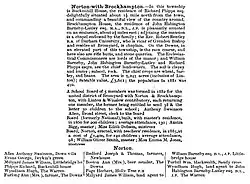 By the 1880s John Habington Barneby Lutley (1840-1906) DL, JP, a chief parish landowner, was the resident of Brockhampton House; the chaplain of the chapel, resident at Bromyard, was also the vicar of Grendon Bishop. The Ecclesiastical Commissioners were the lords of the manor. On Bromyard Downs was a race course, rifle butts and stone quarries. An oak tree was planted in 1887 in commemoration of the Golden Jubilee of Queen Victoria. Parish area, including that of adjacent Linton was 5,243 acres (2,122 hectares). The population in 1881 was 492. A School Board was formed in 1882 covering the united district comprising Bromyard, Norton with Brockhampton, Linton, and Winslow. A Board school (formerly a National school), was built in 1885, at a cost of £1,400; built for 140 pupils, the average attendance was 98. Occupations listed in the Norton part of the parish in 1885 were five farmers, one of whom was a beer & cider retailer at Bromyard Downs, another also a miller at Three Mills, and a third beer & cider retailer at Bromyard Downs, a further beer & cider retailer at Bromyard Downs, the licensee and a & cider retailer at the Holly Tree public house, a blacksmith, a shopkeeper, a gamekeeper, a sawyer, a farm bailiff, and two land agents, one to John Habington Barneby Lutley.[6][7]
