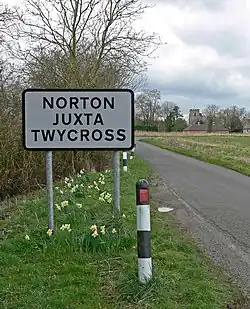 The village has traditionally, and historically, been known as "Norton": deriving from the Anglo-Saxon, meaning "North-Town"; with variable spellings including "Northton" and "Nortone".[3] The village, however, was also known for a brief period in the 17th century as "Hoggs Norton".[3] The village's current name was acquired to differentiate the village from the several others in the county named Norton. "Juxta" is Latin for "near",[4] and Twycross is a small village approximately 2 miles southeast of Norton.