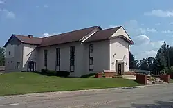 The Norwayne Community Church is located at the southeast corner of Grand Traverse Street and Dorsey Road, atop a small but prominent rise. It is a two-story T-shaped structure built from block, with a gabled roof and a small square belfry. The entrance is in the middle of the front facade under the gable, with eight steps leading to a brick porch. Tall windows line the side elevations. The church has been painted beige.[2]