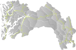 Norwegian National Road 7 (Norwegian: Riksvei 7, Rv7) is a national road in Norway which runs from the town of Hønefoss in Buskerud county to the village of Granvin in Vestland county. The route is 387.6 kilometres (240.8 mi) long and runs east–west through Viken and Vestland counties over the vast Hardangervidda plateau.