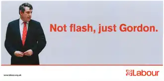 Competing against three other agencies, Saatchi & Saatchi presented fifty posters to the party, with a favourite being selected by party officers.[30] Designed by the agency, this poster involved an image of Brown looking modest, thoughtful, and wearing a lightly creased suit beside the advertising slogan[31] "Not flash, just Gordon".[27][32] On 12 September 2007, because of the poster,[33][34] Labour and Saatchi signed a contract worth several million pounds, and the agency was given control over the party's advertising for the next general election.[35][36] This was announced on the party's website in a statement by Labour's general election co-ordinator Douglas Alexander, with the poster appearing above the announcement.[37] By 16 September, an advertising campaign for the slogan had been launched by the agency,[38] with the poster displayed on billboards and used in political adverts in preparation for a 2007 snap election.[39]