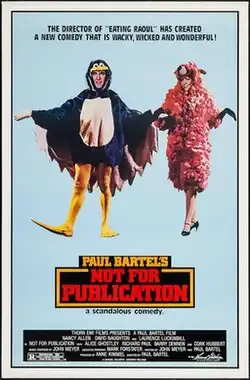Not for Publication is a 1984 American screwball comedy film directed by Paul Bartel and starring Nancy Allen, David Naughton, Laurence Luckinbill, Alan Rosenberg, and Alice Ghostley.[3] The film premiered on November 1, 1984 and was also screened at the 1985 Sundance Film Festival, where it was acquired for distribution by Thorn EMI Screen Entertainment.[4]