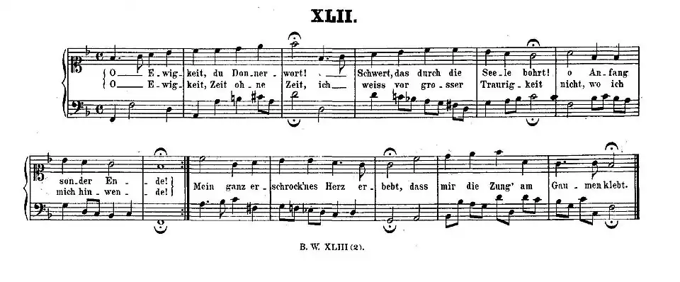 The sacred song "O Ewigkeit, du Donnerwort", BWV 513, No. 42 in the second Notebook, is a setting of the chorale melody with the same name, for voice and continuo:[14]