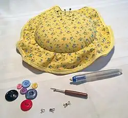 In sewing and haberdashery, notions are small objects or accessories, including items that are sewn or otherwise attached to a finished article, such as buttons, snaps, and collar stays. Notions also include the small tools used in sewing, such as needles, thread, pins, marking pens, elastic, and seam rippers. The noun is almost always used in the plural.[1] The term is chiefly in American English (the equivalent British term is haberdashery). It was also formerly used in the phrase "Yankee notions", meaning American products.[2][3][4][5][6] A fabric store will have a section or department devoted to notions, and a spool of thread is considered a notion.