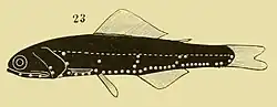 Notoscopelus elongatus is a fairly small lanternfish, growing to a maximum length of about 106 mm (4.2 in). The number of soft rays in the dorsal fin is 21 to 23, in the anal fin 18 to 19, and in the pectoral fins, 12 to 13. There is a distinctive arrangement of photophores (light-emitting organs) on the head and body. At a length of about 52 mm (2.0 in), males develop luminous, glandular patches on the dorsal surface of the caudal peduncle.[3] It is very similar in morphology to Notoscopelus kroyeri but differs in having 23 to 25 gill rakers whereas N. kroyeri has 26 to 29.[4]