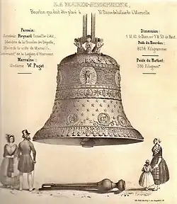 The rebuilding of the bell tower in 1843 was accompanied by the purchase of not just a new bell but a bourdon commissioned from the Lyons foundery of Gédéon Morel thanks to a special collection among the faithful. It was cast on February 11, 1845[39] and arrived in Marseille on September 19, 1845. It was placed in Jean-Jaurès square and blessed on Sunday October 5, 1845, by Eugène de Mazenod and baptized "Marie Joséphine".[40] The bell's godfather was André-Élisée Reynard, then mayor of Marseille, and the godmother of the wife of shipping magnate Wulfran Puget (born Canaple). Their names are engraved on the bell.[41] On October 7, the bell which weighed 8,234 kilograms (18,153 lb), was placed on a harnessed carriage of sixteen horses. It descended by Thiers Street, Leon Gambetta Alley, the Rue du Tapis-Vert, the Cours Belsunce, Canebière, the Rue Paradis, and the Cours Pierre-Puget. Ten horses were added there to the convoy, bringing their number to twenty-six. On October 8, 1845, the ascent of the bell up the hill began with the help of capstans and continued until Friday October 10, when the bell arrived at the summit. The bell was set up on Wednesday October 15.[42] It rang out its first notes on December 8, the day of Immaculate Conception.[43]