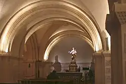 Escaramagne bought at auction an 18th-century statue of the Virgin and child from a monastery of the Picpus Fathers that had been demolished during the Revolution. He offered the statue to the La Garde church. The scepter that the virgin had held was replaced by a bouquet of flowers, hence the statue became known as the "Virgin of the bouquet". To make way for a new silver statue created in 1837, this statue was given to the Montrieux charterhouse, then returned in 1979 to the sanctuary.[29] The statue of the Virgin of the bouquet is currently displayed on the altar in the crypt.