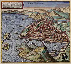 Map of Marseille in 1575, with Notre-Dame de la Garde fort in the foreground. Braun and Hogenberg, Civitates Orbis Terrarum, II-12